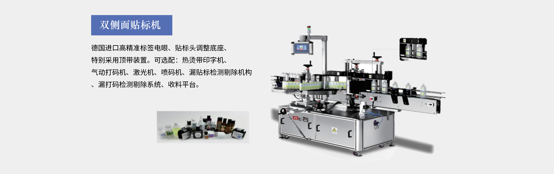 本公司生產(chǎn)的口服液貼標(biāo)機(jī)適合細(xì)長(zhǎng)形圓柱體瓶圓周表面的不干膠標(biāo)簽自動(dòng)貼標(biāo),口服液瓶等,采用彩色人機(jī)界面,離合器設(shè)計(jì),使標(biāo)簽張緊力更加穩(wěn)定,便于提高貼標(biāo)精度3、西門子PLC控制,德國、日本光眼,高精度步進(jìn),貼標(biāo)速度可達(dá)30米/分鐘,可加裝色帶打碼機(jī)、或者熱轉(zhuǎn)印機(jī)。口服液貼標(biāo)機(jī)多為圓瓶貼標(biāo)機(jī)適用于瓶身長(zhǎng),直徑的產(chǎn)品(玻璃塑料都可以,材質(zhì)不限),同時(shí)可加工粉針劑瓶、采血管、水針劑瓶、眼藥水瓶、圓管等,專門針對(duì)...